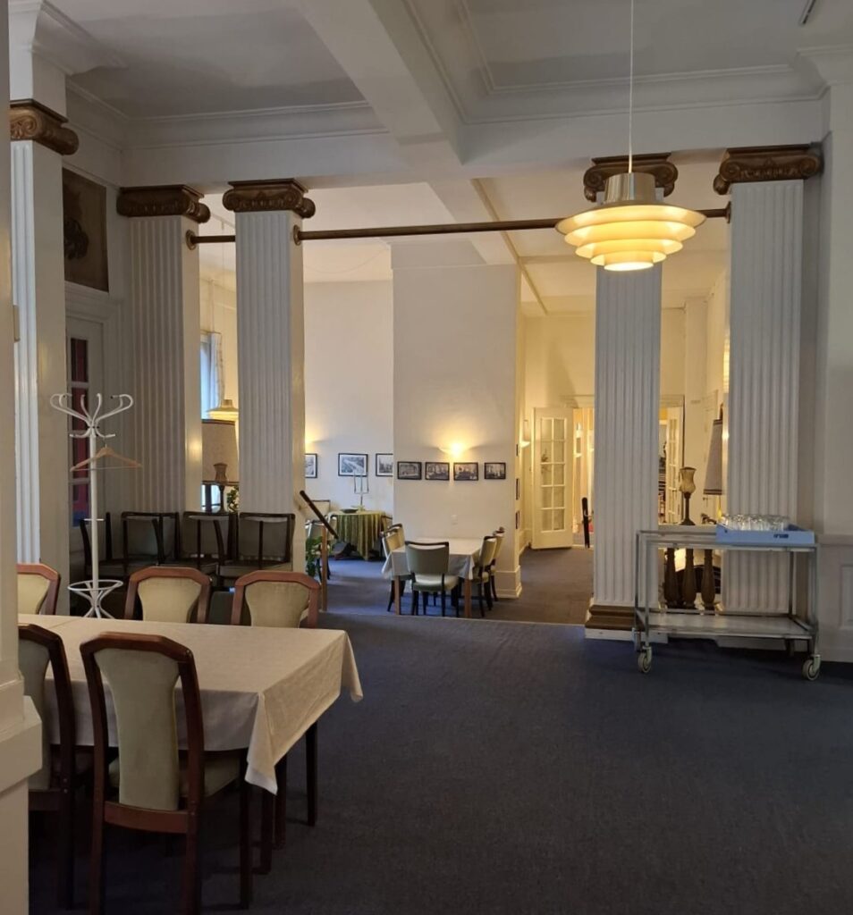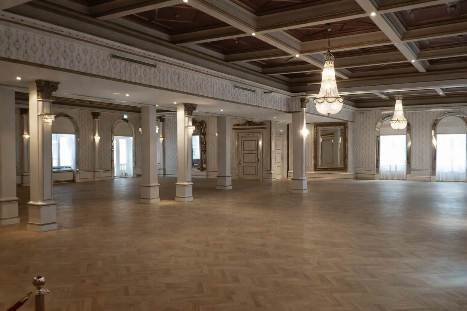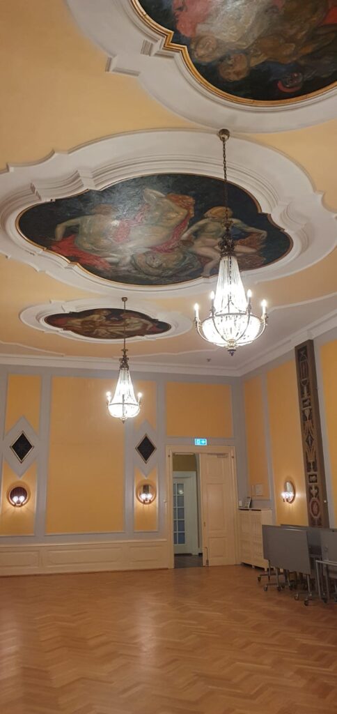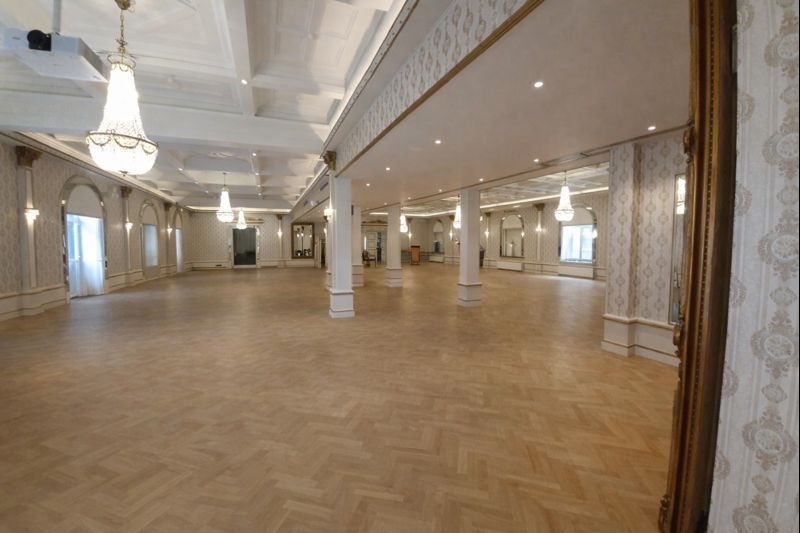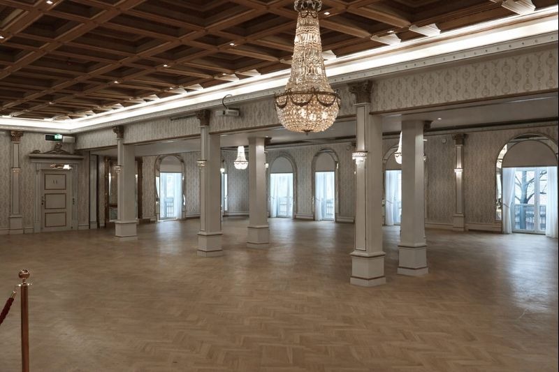 The elegant ballrooms remain intact in their original historic style, featuring original wallpapers, gold-leafed panels, crystal chandeliers, and beautiful old oak parquet floors. The atmosphere is both breathtaking and full of character — a place where history, beauty, and warmth come together.